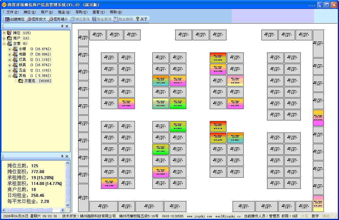 《商貿(mào)市場攤位商戶信息管理系統(tǒng)》 本系統(tǒng)可以適用于各類市場化經(jīng)營場所攤位及商戶的管理、導(dǎo)購。圖形化界面,可以根據(jù)場地實(shí)際狀況創(chuàng)建攤位、商戶。圖形創(chuàng)建智能化,直觀、簡便快捷。攤位信息可以包括編號、坐標(biāo)、長寬、面積、樓層;商戶信息可以包括姓名、性別、年齡、證件、電話、主營商品、承租時間、租金、合同(紙質(zhì)合同可以轉(zhuǎn)換為電子文檔方式存儲)等。還有市場經(jīng)營范圍、商戶主營及經(jīng)營商品等信息。本系統(tǒng)包括攤位使用狀......[查看詳細(xì)]